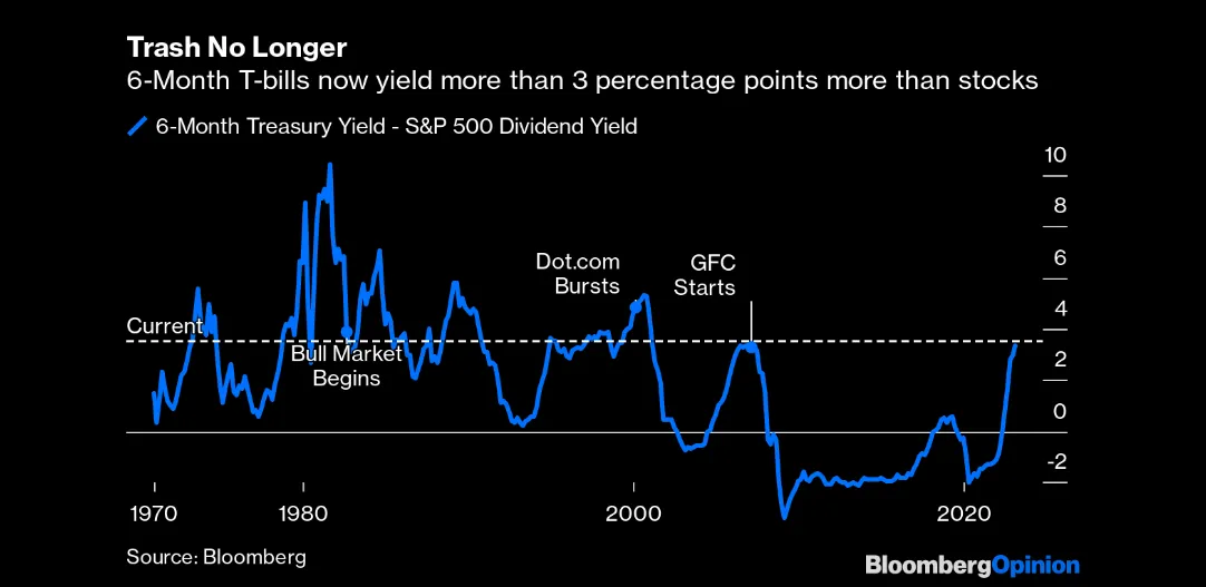 Negli Stati Uniti, con la curva dei tassi governativi invertita da oltre un anno, il rendimento annuo del Treasury bond a 6 mesi (5,02%) ha oltrepassato il rendimento medio annuo dei dividendi delle società dell’indice azionario S&P500 di oltre il 3%, come evidenziato nel grafico che segue che mostra tale differenziale dal 1970 ad oggi.