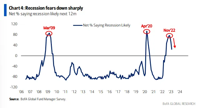 A riprova di quanto appena rilevato, nel grafico che segue si evidenzia che nello scorso mese di novembre il 77% dei gestori interrogati prevedevano una recessione globale nel 2023, mentre tale percentuale è scesa al 24% nello scorso mese di gennaio.