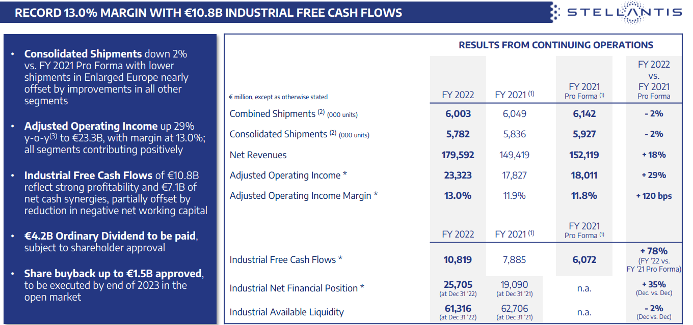 Di seguito si riassumono i principali risultati di Stellantis nel 2022.