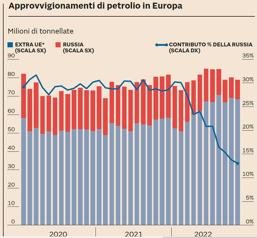 A riprova di quanto appena rilevato, nel grafico che segue si raffigura l'andamento degli approvvigionamenti di petrolio dei Paesi dell’Unione Europea verso la Russia e verso i Paesi "extra UE" dal 2020 ad oggi.