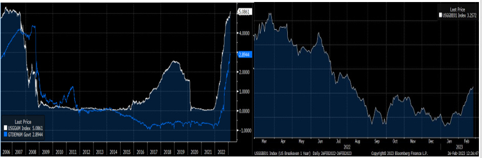Nei due grafici che seguono è possibile notare la recente accelerazione al rialzo dei rendimenti dei titoli di Stato con scadenza semestrale statunitensi (grafico a sinistra, linea bianca) e tedeschi (grafico a sinistra, linea blu) in concomitanza del riaccendersi delle aspettative di inflazione negli Stati Uniti (grafico a destra).