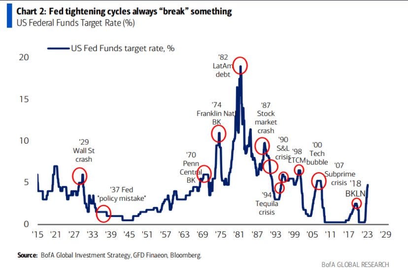Ciò che è successo non rappresenta tuttavia una novità in quanto già in passato abbiamo assistito a clamorosi default di istituzioni finanziarie nel corso di un lungo ciclo di rialzo dei tassi da parte della Federal Reserve, come mostra il grafico che segue: