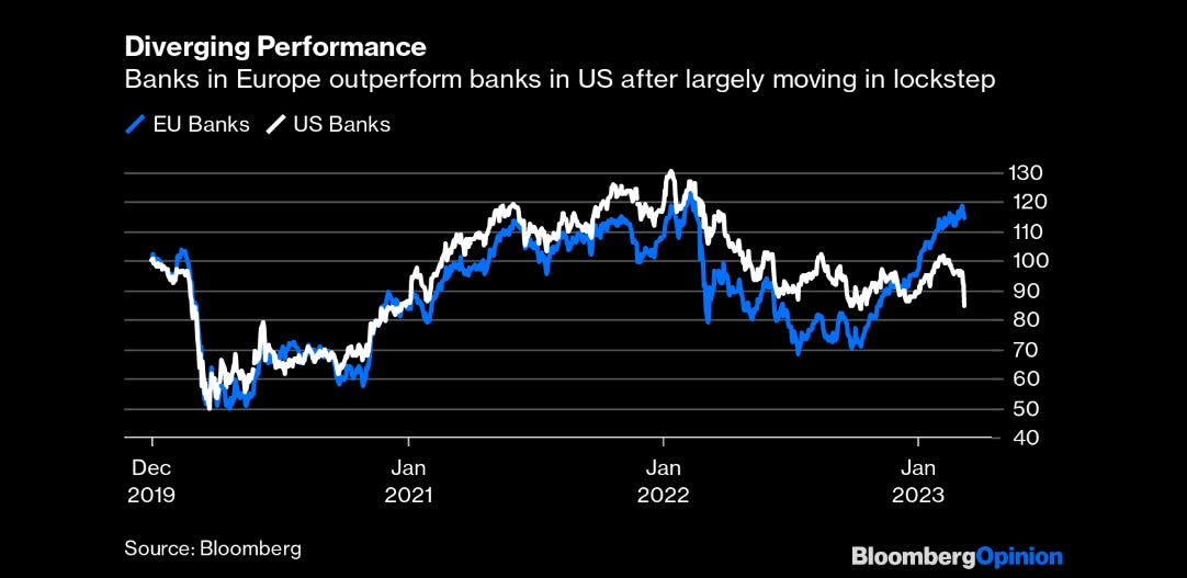 Nel grafico che segue si evidenza la sorprendente divergenza tra l’andamento in Borsa delle banche europee e statunitensi.