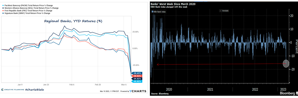 Sui mercati finanziari c’è stato subito l’effetto “contagio”, tanto che alcuni istituti di credito regionali hanno subìto perdite fino al 50% della propria capitalizzazione in un sol giorno e l’indice delle banche americane nelle ultime cinque sedute ha lasciato sul terreno il 16% circa, come evidenziato nei due grafici che seguono.