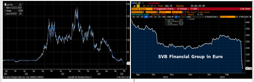Di seguito si mostra l’andamento in Borsa di Silvergate Bank (sinistra) e di Silicon Valley Bank (destra).