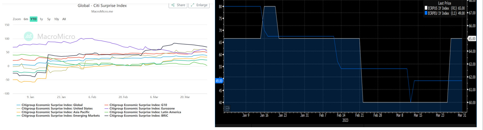 Nei due grafici che seguono si rappresentano rispettivamente l’indice “Citigroup Surprise” di alcuni Stati americani (sinistra) – che misura il differenziale tra aspettative e risultati dei dati economici – e il grafico che esprime le probabilità di recessione negli Stati Uniti e nell’Unione Europea da inizio anno (destra).