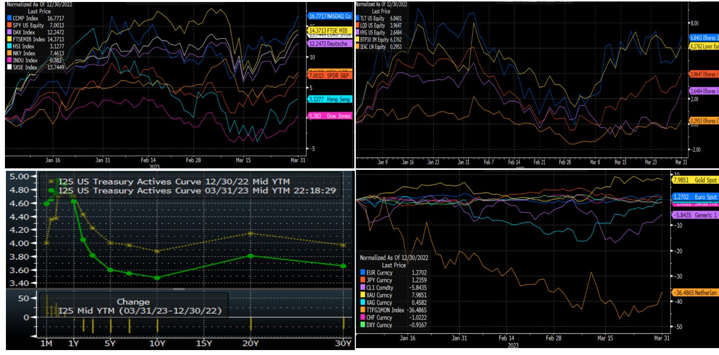 Il movimento al ribasso sul comparto obbligazionario è stato il principale catalizzatore del primo trimestre, favorito innanzitutto da una posizione di partenza favorevole in quanto i tassi di interesse hanno subìto un’impennata nel corso del 2022 a causa delle politiche restrittive delle principali Banche centrali necessarie per combattere l’inflazione.