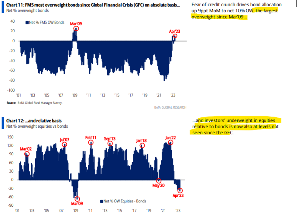 La dinamica sopra descritta si ripete anche nel sondaggio mensile di Bank of America, dove la preferenza dei gestori per le obbligazioni rispetto alle azioni tocca un livello osservato solo nel lontano 2008, come di seguito raffigurato.
