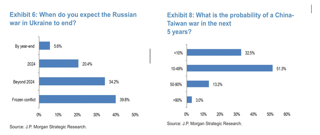 Sul fronte geopolitico, solo il 5,6% dei partecipanti al sondaggio ritiene che la guerra in Ucraina possa concludersi entro il 2023, mentre il 51% assume come probabile l’invasione di Taiwan da parte della Cina entro i prossimi 5 anni, come di seguito riepilogato.