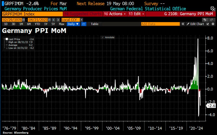 Si segnala inoltre il dato tedesco del mese di aprile sui prezzi alla produzione che riflette un progressivo raffreddamento di tale componente (-2,6% rispetto a -0,5% nel mese di marzo), come è possibile osservare dal grafico che segue.