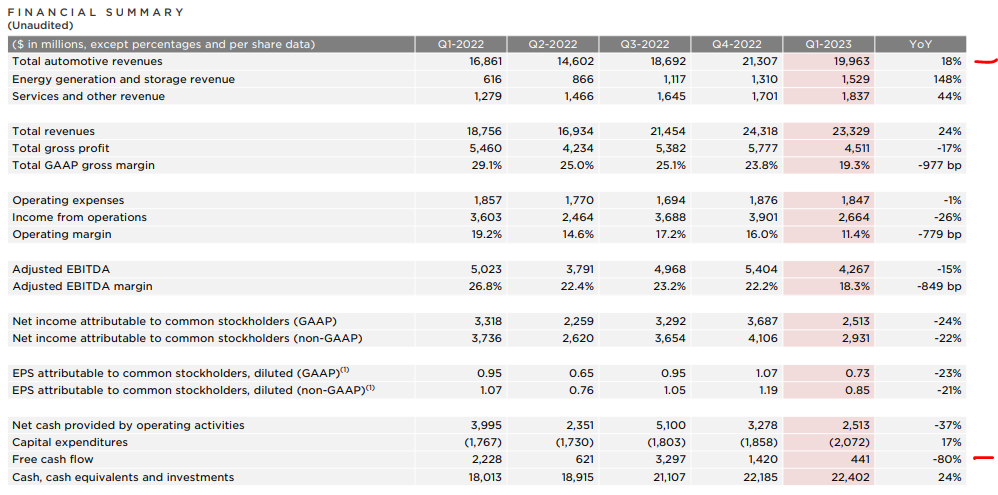 Tesla ha chiuso il primo trimestre del 2023 con ricavi in aumento del 24% a 23,32 miliardi di dollari ma con un utile in calo del 24% a 2,51 miliardi a causa dei reiterati tagli dei prezzi di listino delle automobili allo scopo di sostenere le vendite.