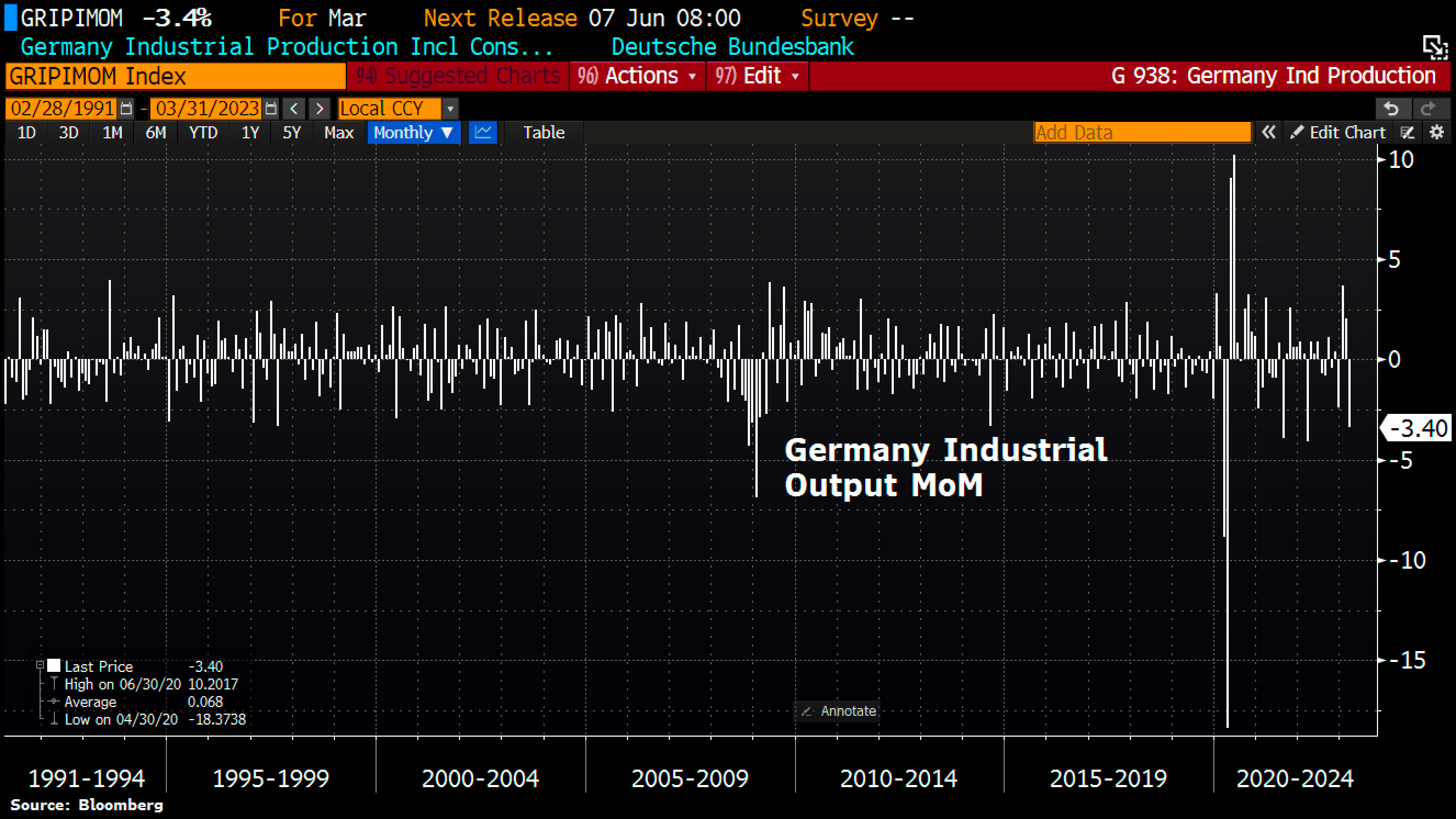 In Germania è stato pubblicato il dato sulla produzione industriale nel mese di marzo che ha registrato un calo del 3,4% (si veda il grafico che segue); le stime degli analisti erano per una discesa dell’1,3%.