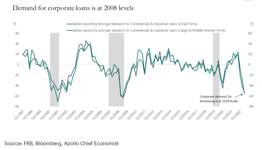 La crisi delle banche regionali americane sta provocando un inasprimento delle condizioni di credito negli Stati Uniti, tanto che le richieste di prestiti bancari da parte delle piccole, medie e grande imprese sono tornate ai minimi dal 2008, come mostra il grafico che segue.