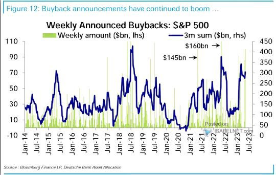 La ripresa del mercato azionario americano è stata favorita anche dai massicci programmi di acquisto di azioni proprie (buyback) effettuati dalle cosiddette “big corporate”, come raffigurato nel grafico che segue nel quale si riporta l’andamento del controvalore settimanale (in verde) e trimestrale (in blu) dei piani di riacquisto di azioni proprie annunciati dalle società dell’indice azionario S&P 500.