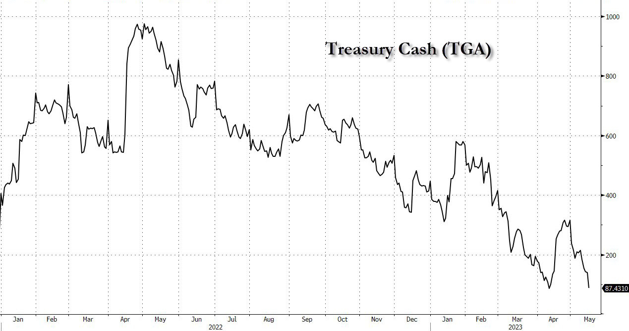 Tiene sempre banco la questione dello sforamento del tetto del debito degli Stati Uniti: la segretaria del Tesoro Janet Yellen ha lanciato l’allarme sottolineando che il suo dipartimento lo scorso venerdì aveva in cassa “solo” 87 miliardi di liquidità e che potrebbe rimanere senza contanti a partire dal prossimo 1 giugno, come evidenziato nel grafico che segue.