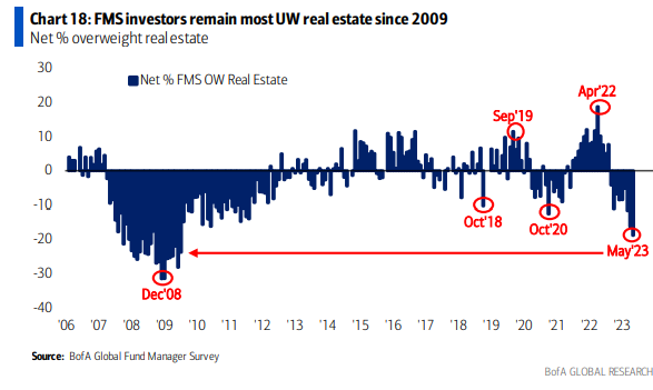 Da sottolineare il clima di forte pessimismo sul settore immobiliare, che si avvicina ai livelli del 2009, principalmente a causa della restrizione delle condizioni creditizie associata ai tassi elevati sui mutui i quali sono cresciuti vertiginosamente negli ultimi 15 mesi.