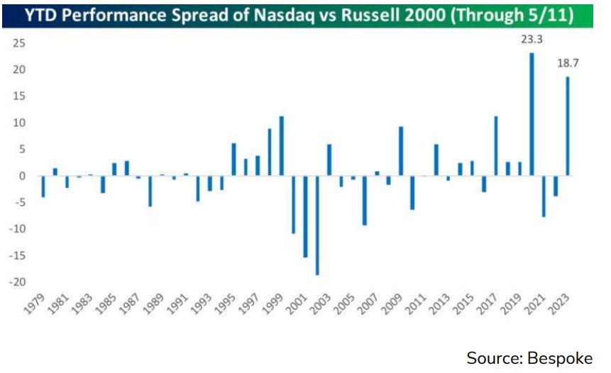 Di seguito rappresentiamo un grafico molto interessante nel quale è raffigurata la differenza in termini di performance annua tra l’indice dei titoli tecnologici Nasdaq 100 e l’indice delle piccole e medie imprese Russell 2000.
