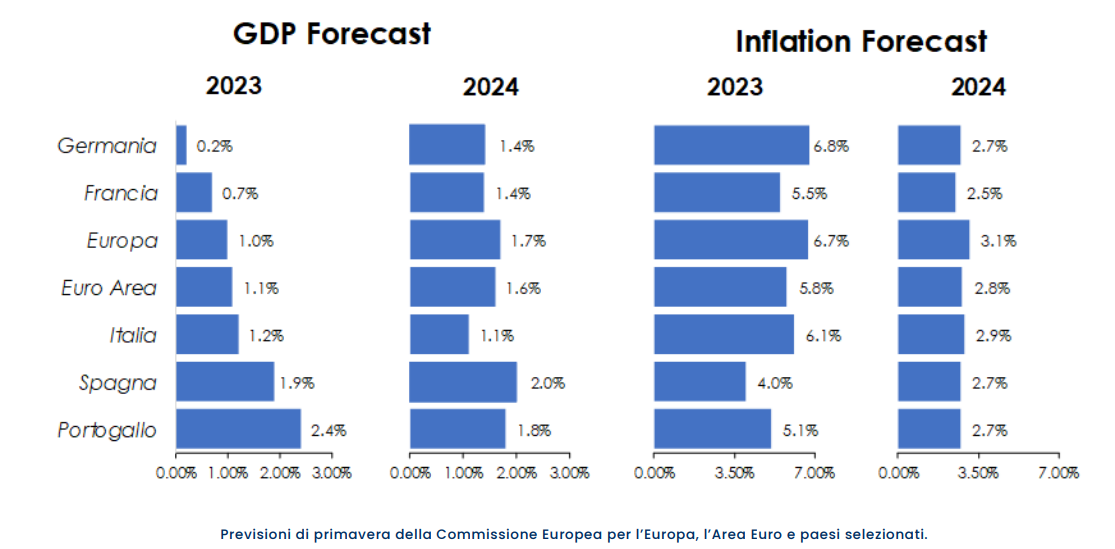 Secondo le previsioni della Commissione, nel 2023 l’Italia registrerà la crescita più elevata tra le prime tre economie europee (+1,1%, rispetto a +0,8% stimato in precedenza), un segnale di una solida resistenza del tessuto imprenditoriale italiano il quale grazie al forte aumento delle esportazioni è riuscito a guadagnare quote di mercato in diversi settori industriali, recuperando il terreno perso a causa della pandemia e della guerra tra Russia e Ucraina.
