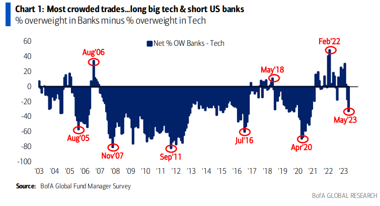 Infine, nella figura che segue si evidenzia come attualmente la stragrande maggioranza dei gestori abbia scelto di sovrapesare il settore tecnologico e di sottopesare il settore bancario.