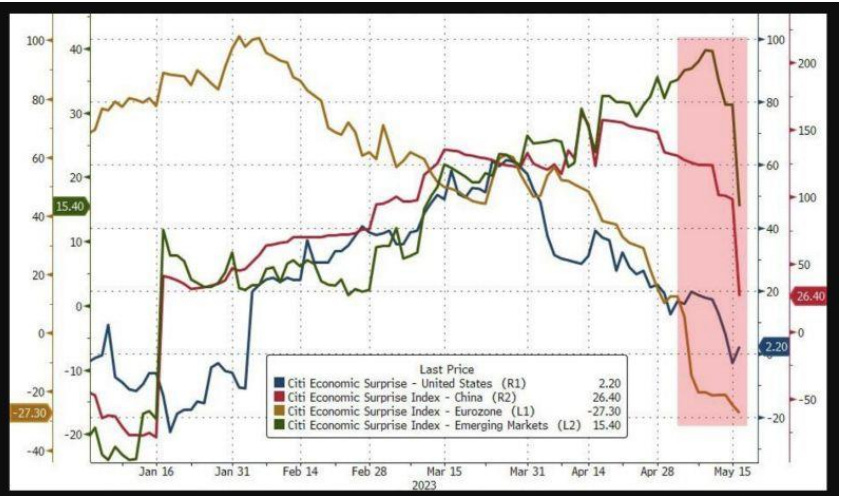 Gli indici pubblicati da Citigroup sulle sorprese macroeconomiche di diversi Paesi – i quali tengono traccia di quanto i risultati effettivi dei principali dati economici (come la crescita del Pil, la produzione industriale, l’occupazione, ecc.) differiscano dalle previsioni degli analisti – sono apparsi in declino, come di seguito raffigurato.