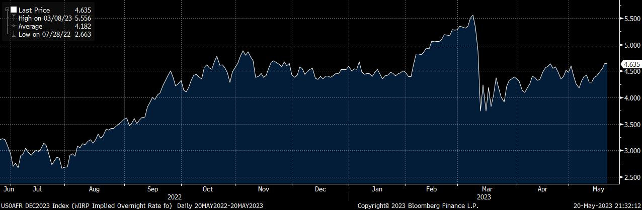 Come diretta conseguenza, il tasso terminale della Federal Reserve previsto nel mese di dicembre 2023, ovvero il livello dei tassi raggiunto il quale la Fed invertirà l’orientamento di politica monetaria, è passato dal 4,38% al 4,65%, come evidenziato nel grafico che segue: