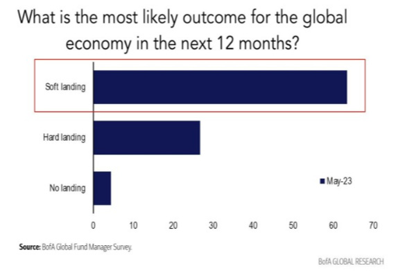 Dopo mesi di pessimismo cosmico da parte della comunità degli economisti, le aspettative di un atterraggio morbido (soft lending) dell’economia mondiale sono aumentate significativamente, come evidenziato nella figura che segue nella quale si rappresentano le probabilità associate a tre diversi ipotetici scenari economici (atterraggio morbido, atterraggio duro, nessun atterraggio).