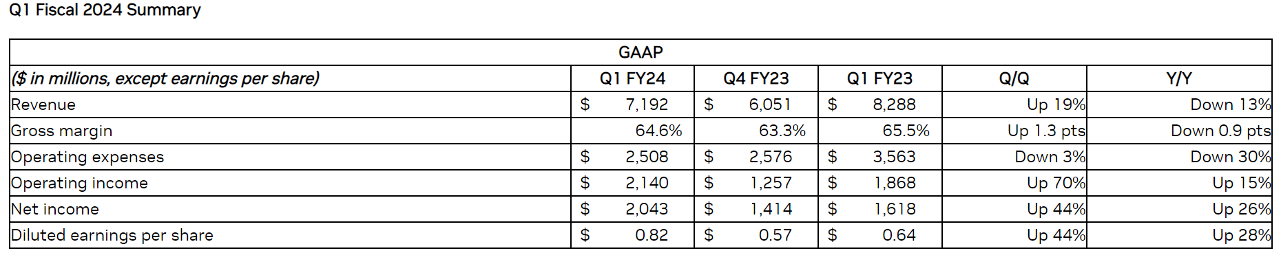Di seguito si riassumono i principali risultati della società Nvidia nel primo trimestre del 2023 (anno fiscale 2024):