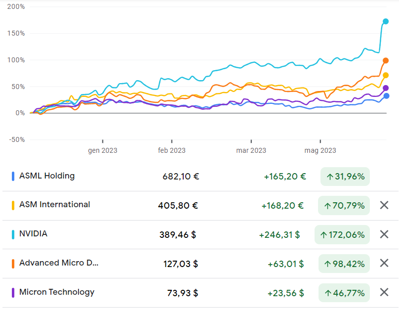 Gli ottimi risultati di Nvidia hanno trascinato al rialzo il settore dei semiconduttori e i titoli tecnologici in generale, come risulta evidente dal grafico che segue nel quale è raffigurata la performance da inizio anno di Nvidia e dei principali produttori di chip europei e americani.