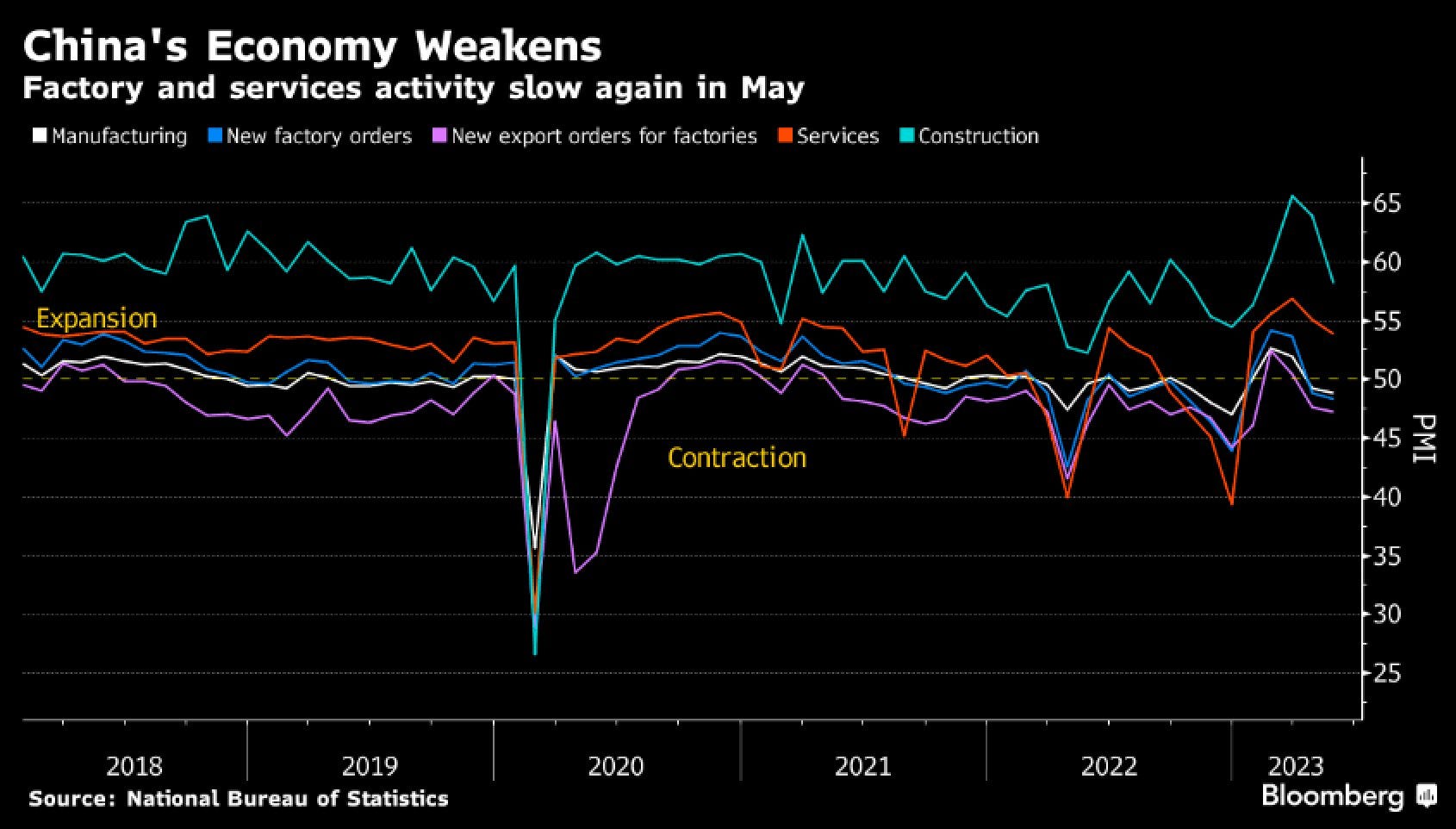 In Cina, l’indice PMI manifatturiero del mese di maggio è sceso a 48,8 punti da 49,2 del mese precedente ed è risultato inferiore anche alle stime degli analisti (51,4) rimanendo sotto la soglia chiave dei 50 punti che denota una contrazione dell’attività economica.
