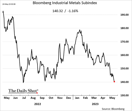 Segnaliamo inoltre il trend ribassista dell’indice dei metalli industriali in corso da inizio anno, causato principalmente dalla difficile ripartenza dell’economia cinese e dalla normalizzazione dei consumi in numerose aree geografiche dopo le forti tensioni successive allo scoppio della guerra tra Russia e Ucraina.