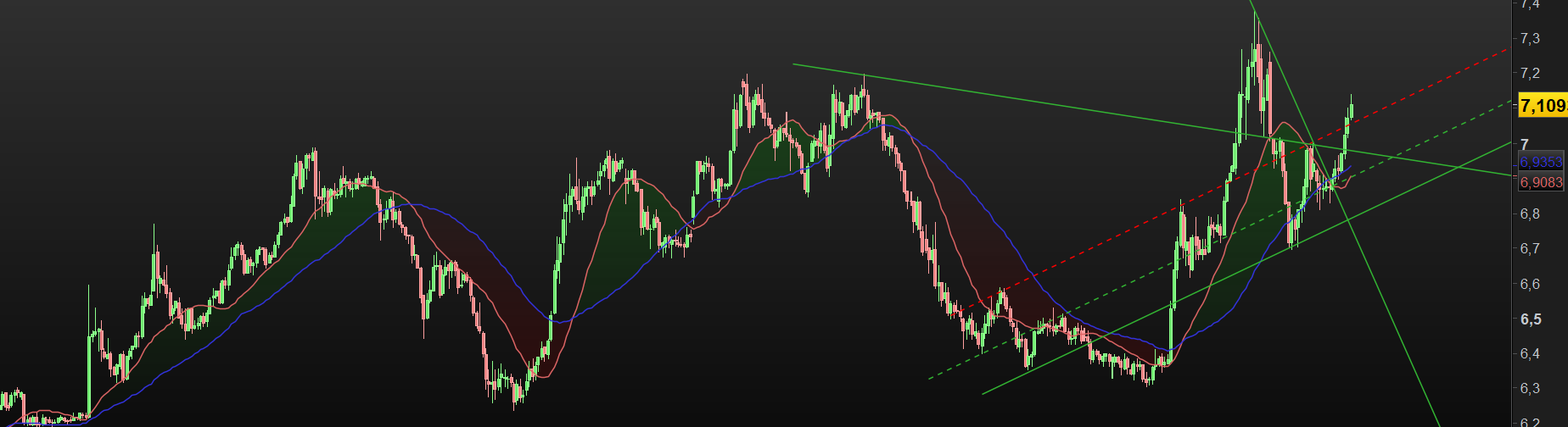 Sul fronte valutario, segnaliamo il generalizzato rafforzamento del dollaro in atto da circa un mese e, in particolare, la rottura della soglia psicologica di 7 yuan contro 1 dollaro che ha dato spinta alla svalutazione della valuta cinese, come evidenziato nel grafico che segue: