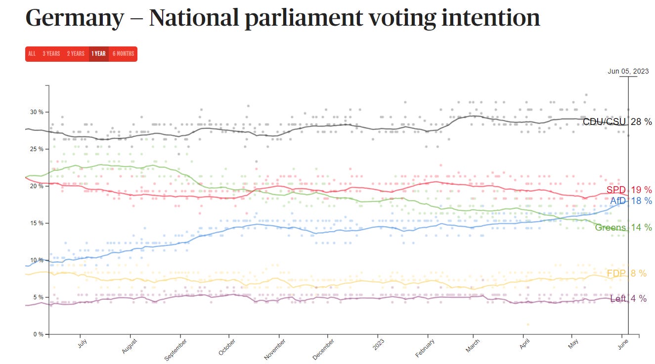 Alla difficile congiuntura della prima economia europea si somma il costante calo di consensi nei sondaggi dell’attuale coalizione di governo a vantaggio del partito AFD (Alternative für Deutschland) da sempre contrario al progetto di un’Europa solidale, come mostra la figura che segue.