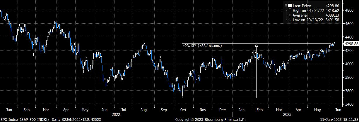 In una settimana in cui il calendario economico non ha offerto particolari spunti è proseguita la corsa dei principali indici azionari mondiali, con l’S&P500 che è ufficialmente entrato in un mercato “toro” in quanto è risalito di oltre il 20% dai minimi del mese di ottobre scorso (si veda il grafico che segue).