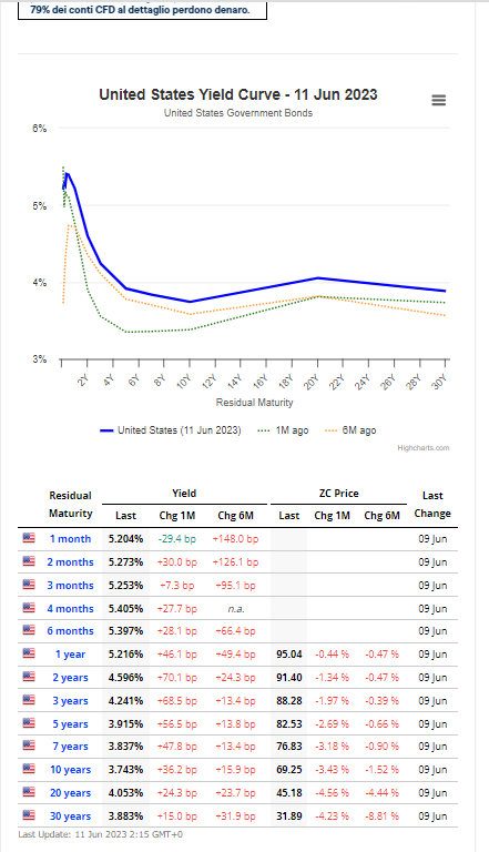 Sul comparto obbligazionario all’interno di uno scenario di bassa volatilità permane l’anomalia rappresentata dall’inversione della curva dei tassi americana, come di seguito raffigurato.