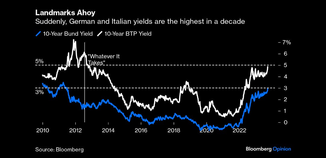 Va evidenziato che recentemente i rendimenti del BTP e del bund tedesco con scadenza decennale hanno entrambi registrato un’impennata al rialzo e adesso sono vicini rispettivamente al 5% e al 3%, livelli che non si registravano dai tempi della crisi del debito sovrano che ha colpito l’Eurozona nel 2010 e nei due anni successivi.