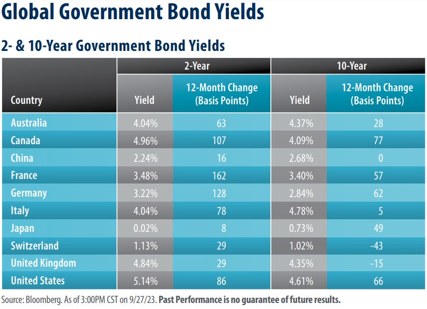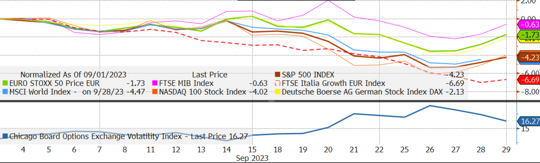 Nel mese di settembre abbiamo assistito a un'insolita correlazione tra bond e azioni, con i principali mercati azionari globali che hanno anch’essi chiuso il mese in rosso con performance comunque non particolarmente pesanti, come di seguito raffigurato:
