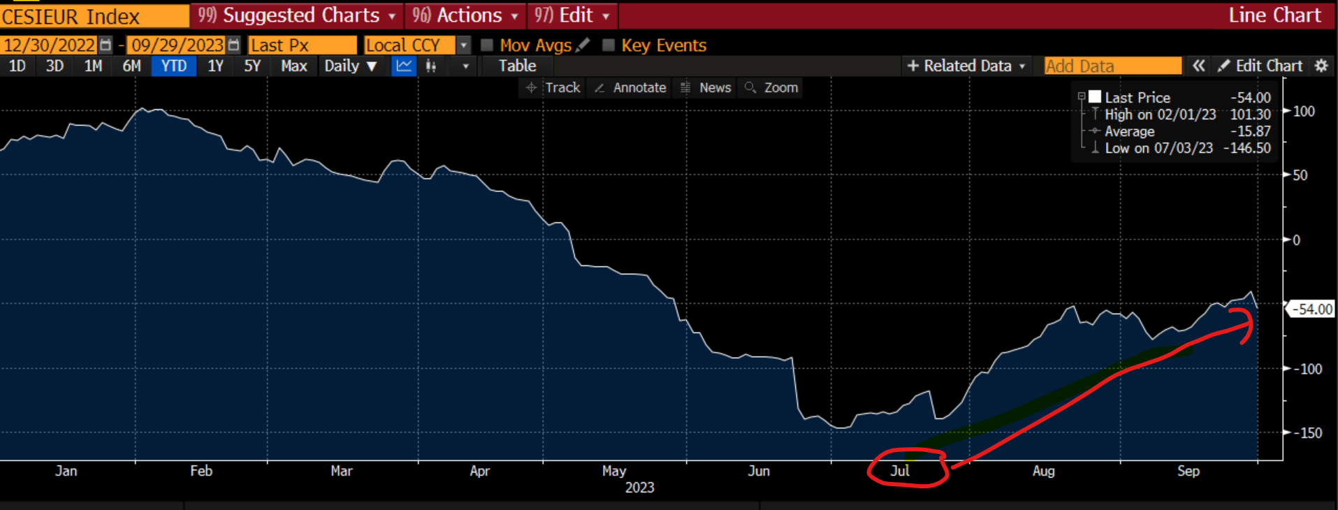 Va inoltre evidenziato che dallo scorso luglio il sentiment sui dati economici europei sta decisamente migliorando, anche se è ancora al di sotto dello zero, come di seguito raffigurato: