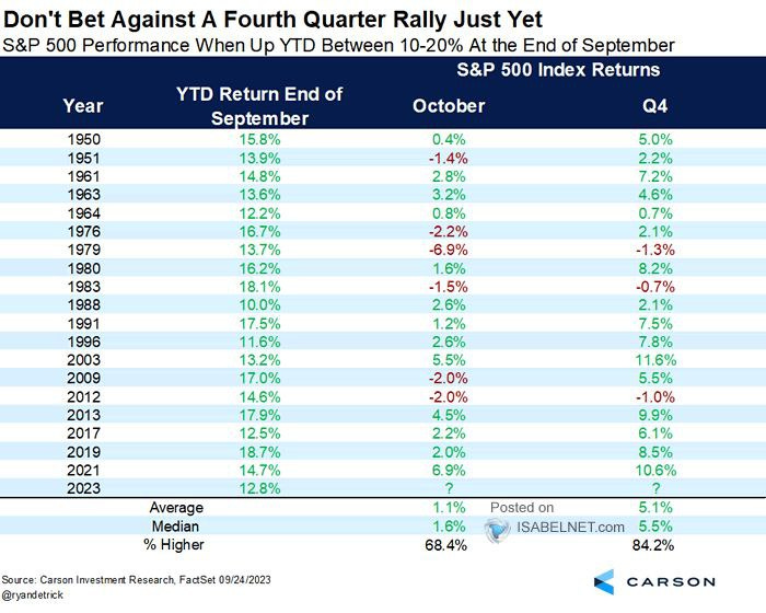 Storicamente nell’ultimo trimestre dell’anno si registra una “stagionalità” positiva sui mercati azionari, come confermato nella tabella che segue nella quale si riassume l’andamento dell’indice azionario americano S&P500 rispettivamente nel mese di ottobre e nell’ultimo trimestre negli anni in cui nei primi 9 mesi dell’anno si è registrata una performance compresa tra il 10% e il 20%: