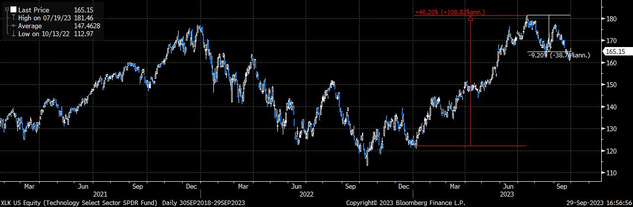 A tal proposito va osservato che qualora dovessimo registrare da qui a fine anno una serie di dati macroeconomici americani al di sotto delle attese, potremmo assistere contestualmente al raggiungimento del picco sui tassi di interesse a lungo termine e a una forte risalita del settore tecnologico americano che è particolarmente sensibile all’inversione del ciclo di rialzo dei tassi e che dai massimi di luglio ha ceduto circa il 10%, come raffigurato nel grafico che segue: