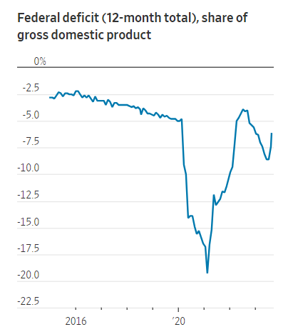 Ricordiamo che il rapporto deficit/Pil negli USA si attesta adesso al livello di -7%, il valore più alto dal 1930 escludendo guerre e recessioni economiche, come di seguito raffigurato.