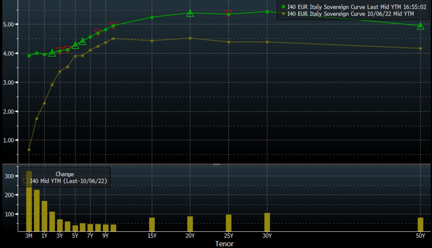 In Italia la curva dei rendimenti ha subìto un evidente movimento rialzista negli ultimi 12 mesi, con la scadenza a 5 anni salita di oltre un punto percentuale, come di seguito raffigurato (linea verde: curva dei tassi attuale, linea gialla: curva dei tassi 12 mesi fa).
