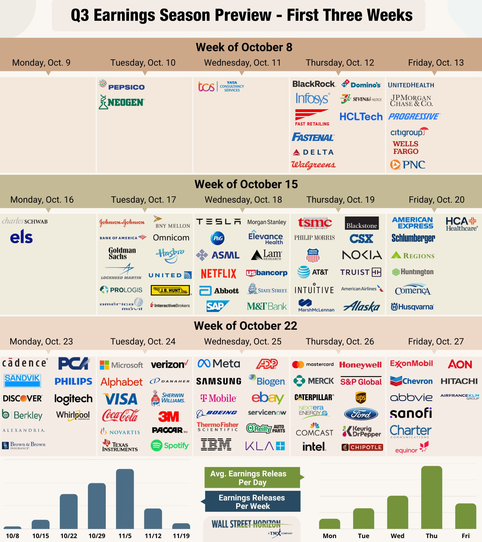 Dalla prossima settimana inizierà la stagione della pubblicazione dei risultati del terzo trimestre del 2023 delle società quotate a Wall Street che, come di consueto, vedrà le grandi banche tra le prime a pubblicare i dati, come raffigurato nel calendario che segue: