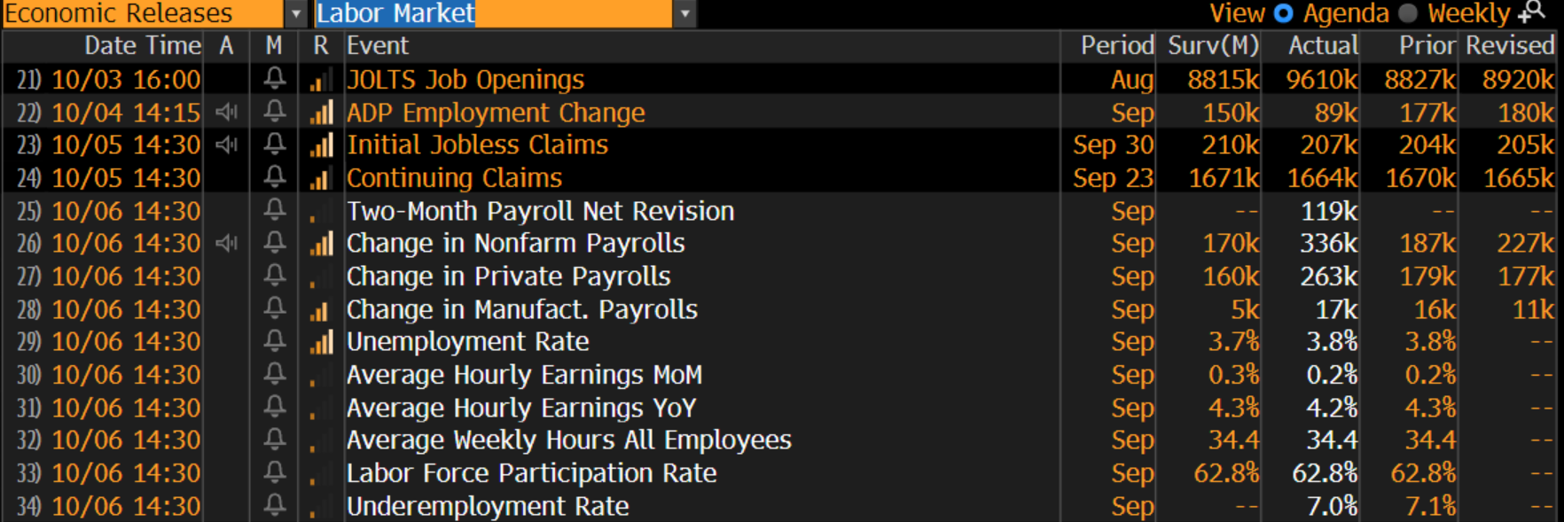 Il mercato del lavoro americano ha confermato la sua solidità nel mese di settembre, con un elevato numero di nuovi posti di lavoro e un numero ridotto di sussidi di disoccupazione, come di seguito rappresentato: