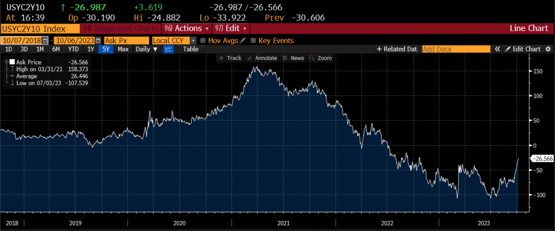 Sul comparto obbligazionario negli ultimi giorni si è assistito a un veloce appiattimento della curva dei rendimenti americana, con il differenziale tra 2 e 10 anni che si è ridotto da -100 punti base a -23 punti base, come raffigurato di seguito.