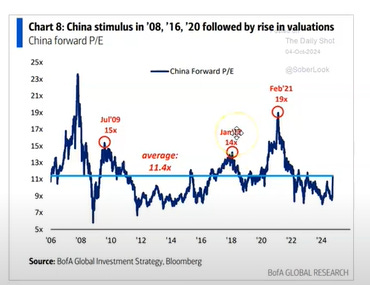 Nel grafico che segue, si nota come la valutazione degli indici azionari cinesi rimanga bassa rispetto a quella dei mercati americani ed europei. Questo potrebbe rappresentare un'opportunità per chi è disposto a investire in Cina, soprattutto in un momento in cui le misure di stimolo economico potrebbero fare la differenza.