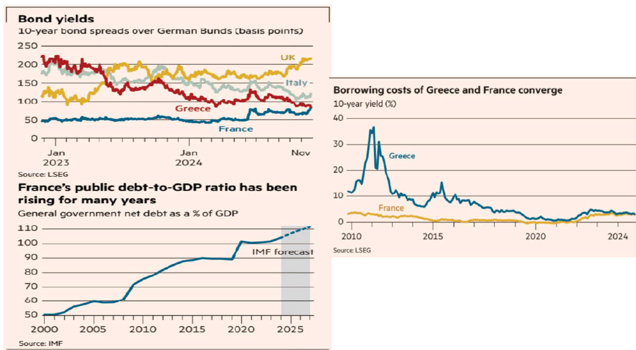 Il terzo grafico, che mostra una convergenza tra i rendimenti dei titoli francesi e quelli greci, è sintomatico della crescente pressione sul debito e del malcontento popolare che rappresentano rischi significativi per la stabilità della Francia.