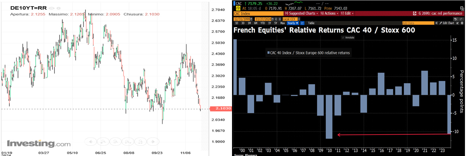 I due grafici che seguono evidenziano due tendenze chiave nei mercati europei. Il calo dei rendimenti del Bund tedesco al 2,1% riflette l’ottimismo su un possibile taglio dei tassi da parte della BCE; al contrario, l’indice azionario CAC 40 francese mostra una netta sottoperformance rispetto allo Stoxx600 europeo, influenzato dalla crescente crisi politica in Francia, che pesa sulla fiducia degli investitori.