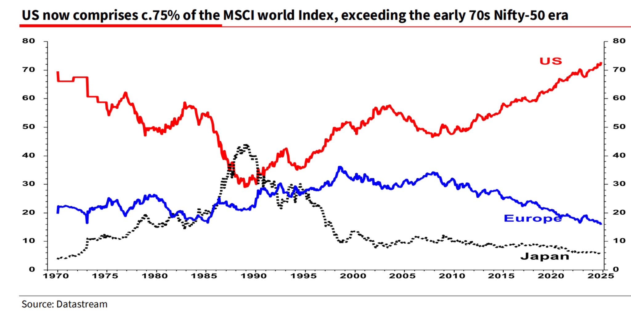 Sebbene questa visione sia condivisa da molti investitori, i veterani del mercato, con una prospettiva storica più ampia, ricordano un precedente significativo. Alla fine degli anni '80, il Giappone costituiva circa il 50% dell'indice mondiale, dominato da un settore bancario ed economico che sembrava inarrestabile.