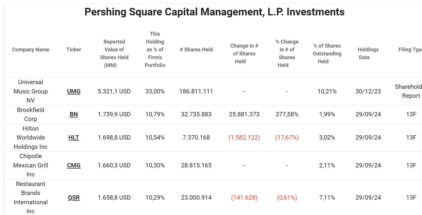 Un'analisi più approfondita del portafoglio rivela infatti una realtà diversa; come mostra la tabella seguente, la sua principale posizione è detenuta nella società olandese Universal Music Group NV, seguita dal gestore canadese di private equity Brookfield Corporation