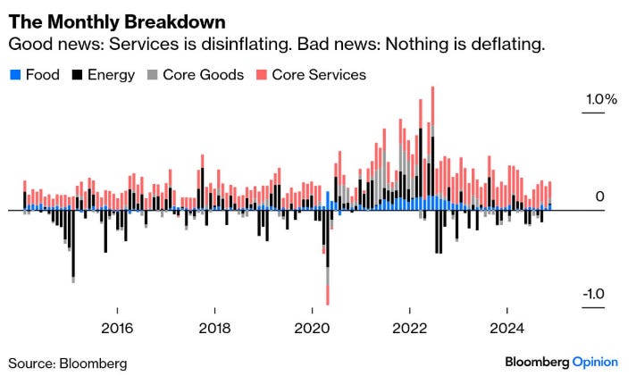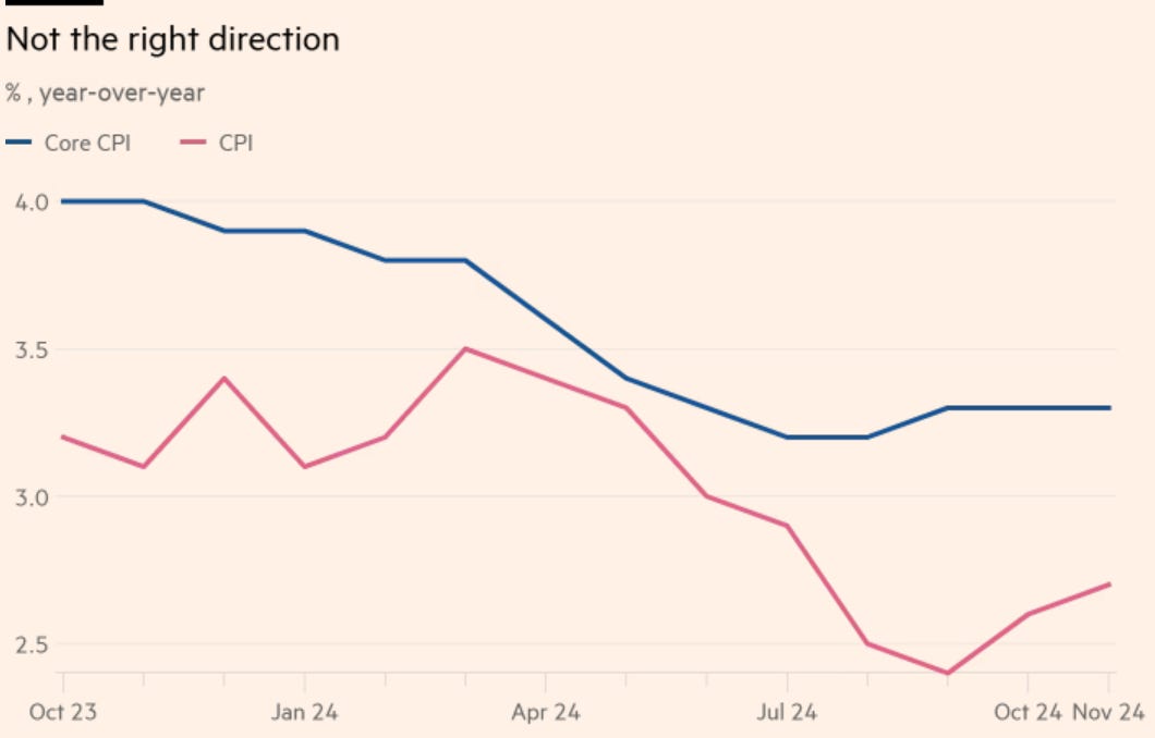 Come mostrano i due grafici sotto riportati, il processo di disinflazione (ovvero il rallentamento del ritmo di crescita dell'inflazione) sembra essersi arrestato, con un incremento dei prezzi nei beni core che compensa la discesa dell’inflazione nei servizi. Questo pone sfide significative per la Federal Reserve, che si appresta a ridurre i tassi di 25 punti base nella prossima riunione del 18 dicembre.